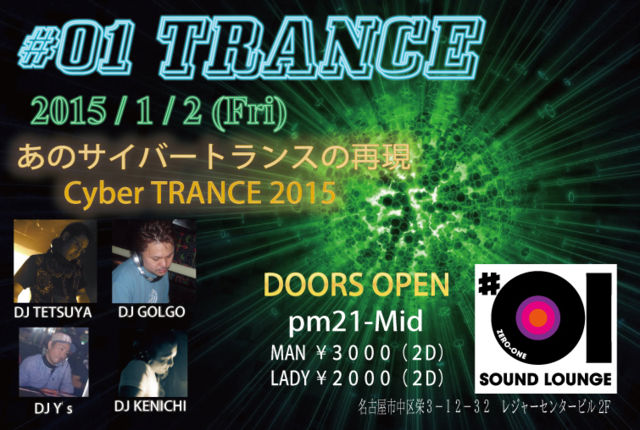 管理人様 告知失礼いたします。 「#01 TRANCE」 あのサイバートランスの再現! CYBER TRANCE 2015 2001年に一大ブームを巻き起こしたCyber TRANCE 今も根強い人気を誇る中、今回はその再現イベント をZERO ONEで開催! SPACIAL GUESUには、六本木VELFARRE、そして現在も agehaで開催されるCyber TRANCEでも活躍する "DJ TETUYA"がSPIN! そして名古屋から、"DJ GOLGO(XLR) 1987年〜ダンスホール、88年〜ペントハウス、 ペン2ハウス、89年〜DION、93年〜名古屋KING&QUEEN、 95年東京へ〜六本木VELFARREレジデン