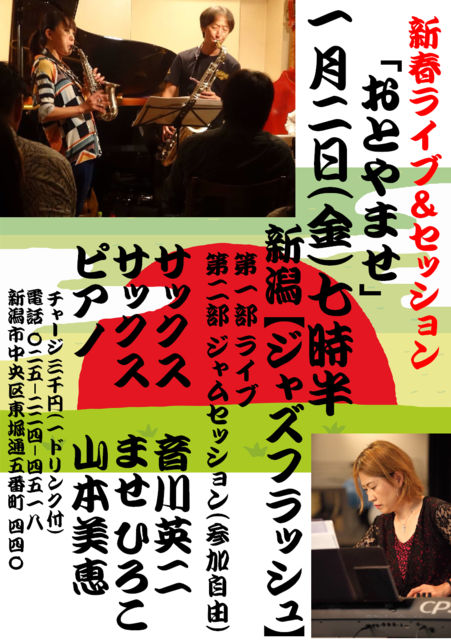 お正月特別企画 ◆1/2(金)19:30〜 新潟【ジャズフラッシュ】 『おとやませ』Live & Session 音川英二(T.Sax)ませ ひろこ(S.Sax)山本美恵(Piano) 第一部:ライブ 第二部:ジャムセッション(参加自由) http://flash.pagans.jp/ Tel.025-224-4518 新潟市中央区東堀通 5 番町 440 昭和新道 小林ビル 1F ライブチャージ3000円(1d付)