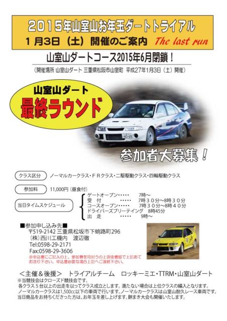 2015年 山室山お年玉ダートトライアル ラストラン!・・・開催のご案内 山室山ダートコースは2015年6月で閉鎖します。 恒例のお年玉ダートトライアルが次回で最終ランになります。 思い出に残る最終戦にエントリーしてみませんか? 申し込みお問い合わせは、 三重県松阪市下蛸路296 西川工機内 渡辺徹 主催TTRM TEL.0598-29-2171 FAX.0598-29-3606 山室山ダートのHPご覧ください。 http://yamamuro.info/