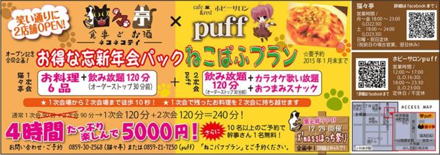 ◇2015 鳥オフ新年会〜雅(みやび)〜◇ ◆日時:平成27年1月3日(土) 19:00〜 ◆予算:5000円(飲み放題付き4時間コース) ◆場所:「猫々亭」 →「puff」 「猫々亭」 鳥取県米子市西倉吉町54 0859-30-2568 http://nekonekotei.net/ 「puff」 鳥取県米子市東倉吉町54-3 2F 0859-21-7250 https://www.facebook.com/hobbysalon.puff 今回は飲食のみの予定です。 ひたすら食べて飲んで喋ります。 2時間経ったら移動しますが、途中参加、途中離脱でも同じ料金プランで一律5000円です。 移動先の「puff」はカラオケ歌