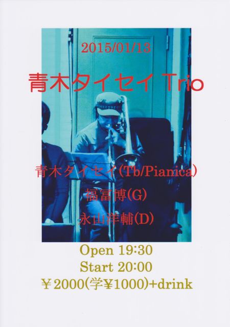 £±£³Æü¡Ê²Ð¡ËJazz ÀÄÌÚ¥¿¥¤¥»¥¤TRIO ÀÄÌÚ¥¿¥¤¥»¥¤(Tb/Pianica) Ê¡ÉÚÇî(G) ±Ê»³ÍÎÊå(D) Open;19:30 Start;20:00 ¡ï2000(³Ø¡ï1000)+drink