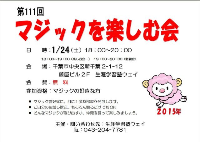 ´ðËÜ¡§Ëè·îÂè4ÅÚÍËÆü¤Ë³«ºÅ¤·¤Þ¤¹¡£ 18»þ¡Á20»þ ¾Ü¤·¤¯¤Ï http://www5d.biglobe.ne.jp/~way1/annnai.htm ³§¤µ¤ó¡¢º£Ç¯¤â°ì½ï¤Ë¥Þ¥¸¥Ã¥¯¤ò³Ú¤·¤ß¤Þ¤·¤ç¤¦¡ª ¤ªÂÔ¤Á¤·¤Æ¤¤¤Þ¤¹¡£