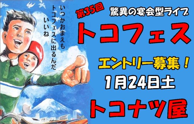 トコナツ屋の恒例ライブ「第35回トコフェス」を1月24日(土曜日)に開催いたします。 「広島で唯一、鼻唄気分で出演できるライブ」と定評のあるトコフェス。 この素敵なライブに、出てみませんか? トコフェスは飲んで騒いで歌って遊ぶ宴会型ライブです。フォーク、洋楽、日本歌謡、インストなどジャンル不問。 腕の差も関係なく、初心者からベテランまで誰でも参加できます。 度胸試し、鬱憤ばらし、何でも結構。 どうぞ、奮ってご参加ください。 詳細は下記のとおりです。 開催日 1月24日(土曜日) 時 間 18