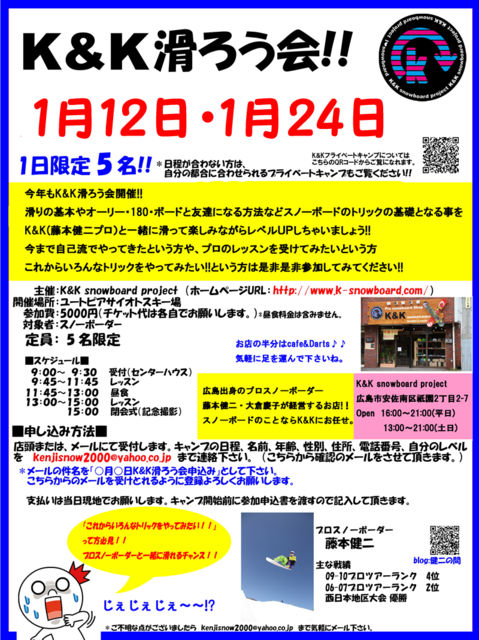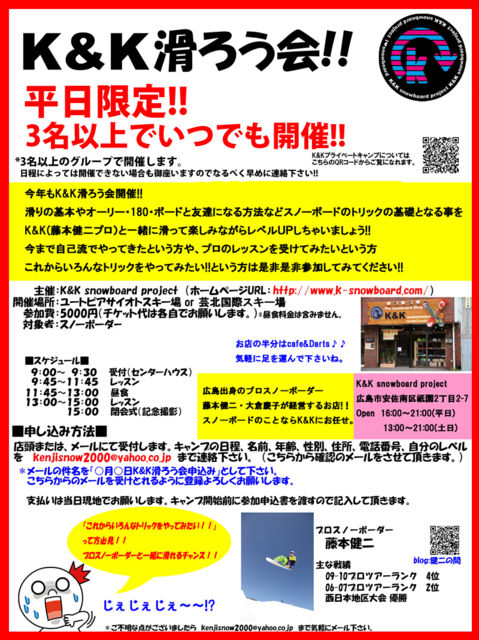 ■□■□■□■□■□■□■□■□■□■□■□■□■□■□■□■□ プロスノーボーダー藤本健二によるスノーボードキャンプ。 今年も「K&K滑ろう会」開催決定!! 今年は色んなトリックや技にチャレンジしてみたいって方は是非参加してみて下さい。 オーリー、グラトリにチャレンジしちゃいましょう!! これから色々トライしてみたいという方は是非参加して下さい!! ☆皆さん一緒に楽しみましょう☆ 主催: K&K snowboard project(URL:http://www.k-snowboard.com/) 場所: ユートピアサイオトスキー場or芸北国際スキー場