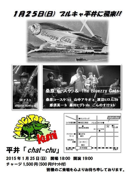 ÅÔÆâ¥é¥¤¥Ö¥Ï¥¦¥¹¤ÇÄê´üŪ¤Ë¥é¥¤¥Ö¤ò¹Ô¤Ã¤Æ¤¤¤ë·¬¸¶¥³¡¼¥¹¥± & The Bluezzy Cats¤Î³§¤µ¤ó¡£ Bassist¤ÎÆá¿Ü¤µ¤ó¤«¤é¤´¾Ò²ðĺ¤Chat-chu¸ø±é¤¬¼Â¸½¤·¤Þ¤·¤¿^^ ¤·¤«¤âº£²ó¤Ï½÷À¥Ö¥ë¡¼¥¹Gt.&Vocalist¤Î¥¢¥ê¥²¡¼¥¿¡¼Kumi¤µ¤ó¤ò¥²¥¹¥È¤Ë·Þ¤¨¤Æ¤ÎÅо졪 ¤³¤ì¤ò¸«Æ¨¤·¤Á¤ã¡Á¥À¥á¤è¡Á¥À¥á¥À¥á¡Á£÷£÷ 2015ǯ1·î25Æü(Æü) OPEN¡¡18:00 START¡¡19:00 ¥Á¥ã¡¼¥¸¡ï1,500(¡ï500¥Á¥±¥Ã¥ÈÉÕ) Vo.·¬¸¶¥³¡¼¥¹¥± Gt.»³Ã楢¥¥ª Ts.ÅÏÊÕ¥Ò¥í¥à Bs.Æá¿Ü±Ñ°ì Ds.¹õÀî¥Ò¥Ç¥È Kb.¤´¤ó¤Î¤¹¤± SP¥²¥¹¥È Gt.&Vo.alligator kumi ³§ÍͤΤ´ÍèŹ¤ò¿´¤è¤ê¤ªÂÔ