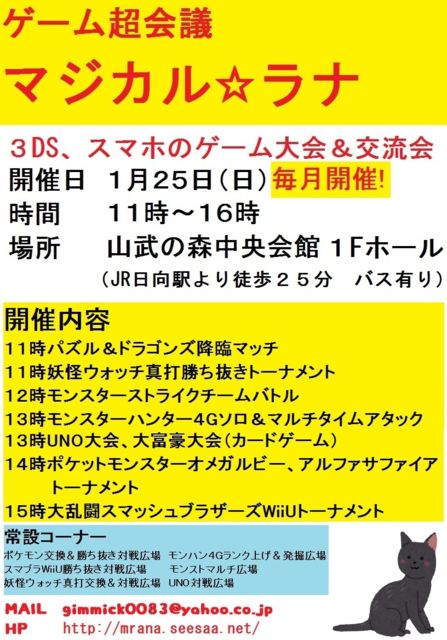 千葉県山武市というところでゲーム大会を開催している「マジカル☆ラナ」と申します。 妖怪ウォッチ真打の大会&交流会を開催するので投稿させていただきます! ホームページ http://mrana.seesaa.net/