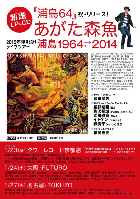 新譜LP&CD『浦島64』弾き語りライヴ! at 名古屋・TOKUZO ◆2015年1月27日(火) 新譜LP&CD『浦島64』発売 あがた森魚弾き語りライヴツアー 「浦島1964←→2014」 at 名古屋・TOKUZO (名古屋市千種区今池1-6-8 ブルースタービル2F) open 18:30 start 19:30 予約 3,000円 当日 3,500円 問:TOKUZO http://www.tokuzo.com/(phone:052-733-3709(18:00〜29:00)/mail mailto:info@tokuzo.com)