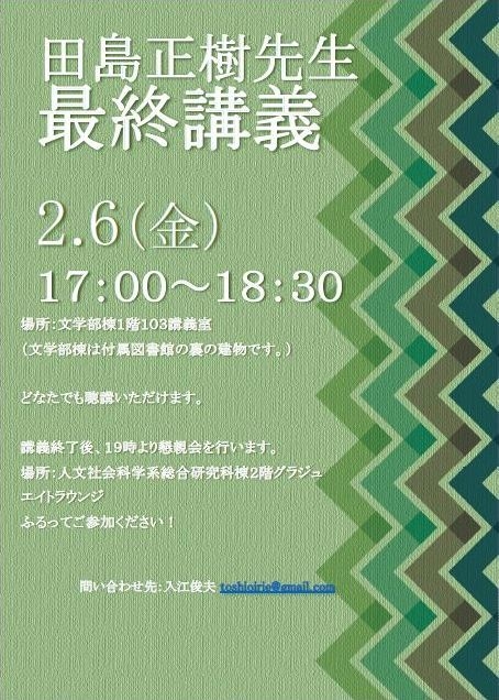 °Ê²¼¤ÎÆü»þ¤Ç¡¢ÅÄÅçÀèÀ¸¤ÎºÇ½ª¹ÖµÁ¤¬³«ºÅ¤µ¤ì¤Þ¤¹¡£ ¸æÀ¤Ïäˤʤä¿Êý¤â¡¢¶½Ì£¤¬¤¢¤ë¤À¤±¤ÎÊý¤â¡¢¤¼¤Ò¤ò±¿¤ó¤Ç¤¤¤¿¤À¤±¤ì¤Ð¤È»×¤¤¤Þ¤¹¡£ //////////////////////////////////////////// ÅÄÅçÀµ¼ùÀèÀ¸ ºÇ½ª¹ÖµÁ 2015.2.6¡Ê¶â¡Ë 17:00¡Á18:30 ¾ì½ê¡§Ê¸³ØÉôÅ³¬£±£°£³¹ÖµÁ¼¼ ¡Êʸ³ØÉôÅï¤ÏÉÕ°¿Þ½ñ´Û¤Î΢¤Î·úʪ¤Ç¤¹¡£¡Ë ¤É¤Ê¤¿¤Ç¤âݹ֤¤¤¿¤À¤±¤Þ¤¹¡£ ¹ÖµÁ½ªÎ»¸å¡¢£±£¹»þ¤è¤êº©¿Æ²ñ¤ò¹Ô¤¤¤Þ¤¹¡£ ¾ì½ê¡§¿Íʸ¼Ò²ñ²Ê³Ø·ÏÁí¹ç¸¦µæ²ÊÅ³¬¥°¥é¥¸¥å¥¨¥¤¥È¥é¥¦¥ó¥¸ ¤Õ¤ë¤Ã¤Æ¤´»²²Ã¤¯¤À¤µ¤¤¡ª