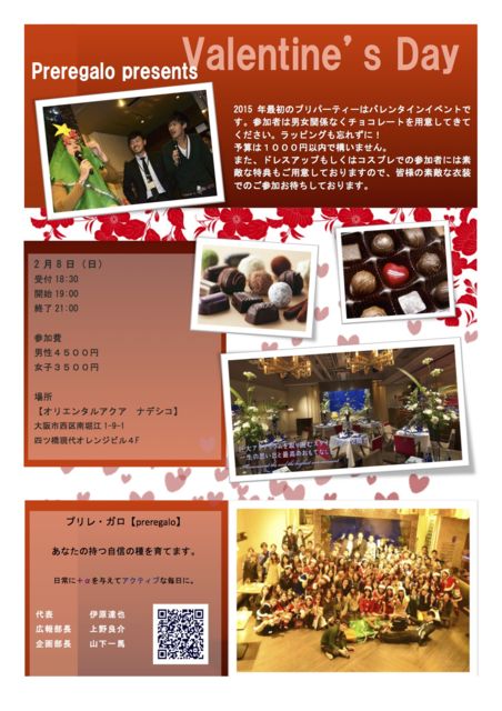 2月8日(日) 18:30受付 19:00開始 21:00終了 ★服装自由★ ドレスアップして来場された方には素敵な特典を!! ★参加費★ 男性4500円 女性3500円 この度はバレンタイン企画プリパーティーを2月8日に開催する運びとなりました。 この会は、いつもの雰囲気とは違う、「Quantity & Quality 」 つまり「量よりも質」を追求した交流会です。 同好会幹事が、厳選した出会いをプロデュースいたします。 会場は堀江の立花通りで人気のあるデザイナーズレストラン。また、参加者が楽しく交流で