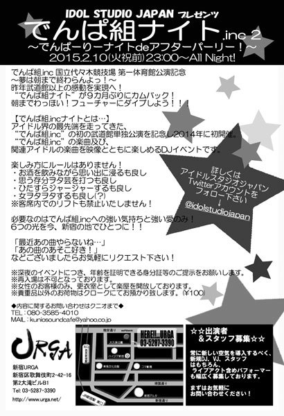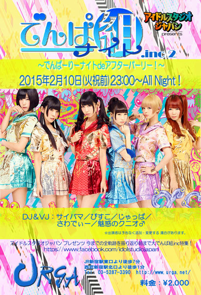 特別企画のお知らせです! 詳細は常時更新して参ります。 代々木体育館公演後の興奮をそのままに盛り上がれれば幸いです! “でんぱ組ナイト.inc 2” 〜でんぱーりーナイトdeアフターパーリー!〜 日時:2015年2月10日(火祝前)23:00〜All Night! 会場:新宿URGA 03-5287-3390 住所:新宿区歌舞伎町2-42-16第二大滝ビルB1 http://www.urga.net/ 料金:当日2000円 ※深夜のイベントにつき、年齢を証明できる身分証等のご提示をお願いします。 ※再入場は不可となっております。 ※女性のお客様のみ、更衣室として楽屋を