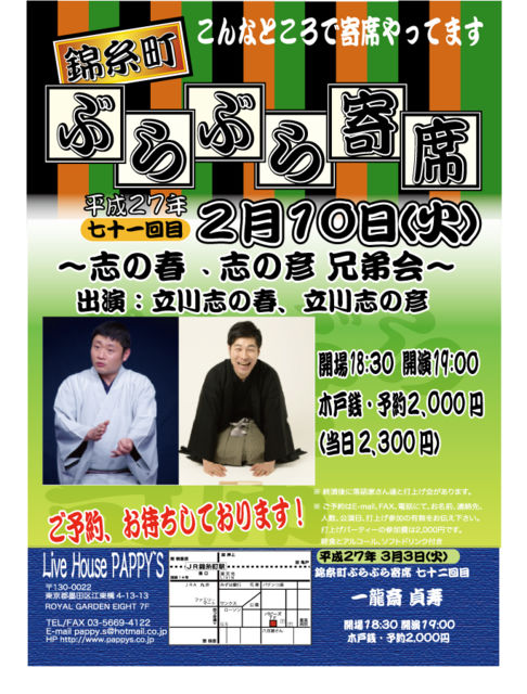 2/10(火)『錦糸町ぶらぶら寄席 71回目』 〜志の春、志の彦 兄弟会〜 のご案内です。 出演:立川志の春、立川志の彦 開場18:30 開演19:00 木戸銭・予約 2000円(当日 2300円) 終演後に打ち上げ会があります。 軽食とアルコールとソフトドリンクを用意させて頂きます。 落語家さんと楽しいお話が出来ます。 参加費別途 2000円 ご予約はメールpappy.s@hotmail.co.jp 電話/FAX 03-5669-4122 まで お気軽にお問い合わせ下さい。 立川志の春HP http://shinoharu.com/ 立川志の彦HP http://shinohiko.co
