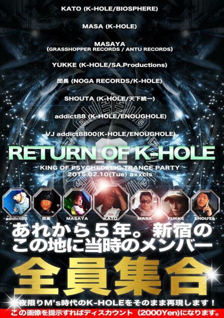 2月10日(火/祝前日)新宿axxcis M’s Night! RETURN OF K-HOLE KING OF PSYCHEDELIC TRANCE PARTY あれから5年 新宿M’s の跡地に 当時のメンバー全員集合 <Open>23:00 <Genre>Psychedelic Trance 団長のゲストと言って頂ければ ディスカウント料金になります <Door>¥3,000/ <Discount>¥2,000 ★DJ’s★ KATO (K-HOLE/BIOSPHERE) MASA (K-HOLE) MASAYA (GRASSHOPPER RECORDS) 団長 (K-HOLE/NOGA RECORDS) SHOUTA (K-HOLE/天下統一) Assict88 (K-H
