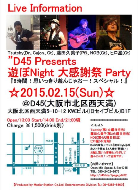 D45¤Î´ÇÈÄ¥¤¥Ù¥ó¥È¡ØÍ·¤ÜNight¡Ù¤Î¥Û¥¹¥È¤ò̳¤á¤ë4¿Í½°¤¬ÀªÂ·¤¤¡ª ¤ª±Û¤·Äº¤¤¤¿³§Íͤȥ³¥é¥Ü¤·¤ÆÍ·¤ó¤¸¤ã¤ª¡ª¤Ã¤Æ´ë²è¤Ç¤¹¡£ ¡ÁD45 Presents¡Á¡¡¡ÉÍ·¤ÜNight Âç´¶¼Õº× Party¡É ¡Ø8»þ´Ö¡ª»×¤¤¤Ã¤¤êÍ·¤ó¤¸¤ã¤ª¡¼¡ª¥¹¥Ú¥·¥ã¥ë¡ª¡Ù Æü»þ¡§2·î15Æü(Æü) ¡¡¡¡¡¡13:00¥ª¡¼¥×¥ó¡¡14:00¥¹¥¿¡¼¥È¡¡21:00º¢¤Þ¤Ç ¾ì½ê¡§¤â¤Á¤í¤ó¡ªOpen Mic Space & Bar D45 ¡¡¡¡¡¡ÂçºåË̶èÀ¾Å·Ëþ5-10-12 KWI¥Ó¥ë(µì¥»¥¤¥Ö¥Ó¥ë)B1F ¤ªÍ·¤ÓÂå¡§¡ï1,500(drinkÊÌ) Host¡§Tsutchy(Âè1²ÐÍËÆüôÅö Dr¡¢Cajon¡¢Gt) ¡¡¡¡¡¡Æ£Åĵ×Èþ»Ò(Âè3²ÐÍËÆüôÅö Pf) ¡¡¡¡¡¡NOB(Âè
