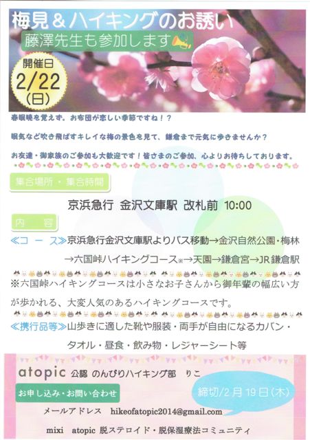 少し早いのですが、来年の梅見&鎌倉ハイキングの企画を立てました〜 お友達・ご家族のご参加も大歓迎です!皆様のご参加、お待ちしております♫ 藤澤先生もご参加されます! 六国峠ハイキングコースは高低差がほとんどなく、小さなお子さんからご年配の方々まで幅広い方々に人気があるハイキングコースです。 開催日 : 2015年2月22日(日) 時間: 10時〜16時 集合場所:京浜急行 金沢文庫駅 改札前 改札場所 :JR鎌倉駅 【内容】 コース :京浜急行 金沢文庫駅→金沢文庫駅からバス移動→北谷バス停下車→金沢自然公園→総数約2