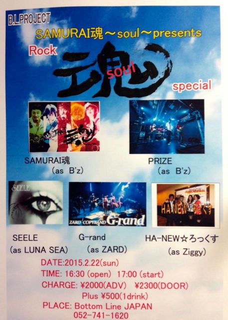 お待たせしました!チケット取り置きを開始致します♪ Rock魂〜soul〜 【日時】2015年2月22日(日) 16:30開場 17:00スタート 21:15終了予定 【会場】名古屋 今池 ボトムライン 【チケット】取り置き¥2,000 当日¥2,300 (Drink別¥500) 【演奏時間】1バンド 40分 G-randは17:50頃からの予定です。 出演順 HA-NEW☆ろっくす (ZIGGY) G-rand (ZARD) ← ここ! SEELE (LUNA SEA) SAMURI魂〜soul〜(B´z) PRIZE (B´z) 2.22はJ-POPだけですのでG-randだけではなく他のバンドさんもB'z、LUNA SEAなどおなじ