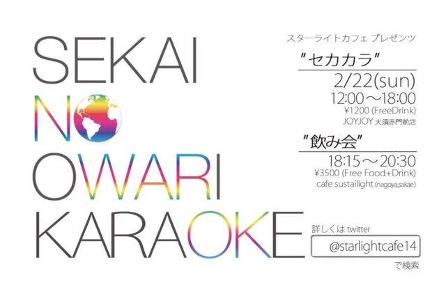 ¿·Ç¯¤â¤¢¤±¡¢¤¤¿¤ë1/14¤Ënew¥¢¥ë¥Ð¥à¤ò¥ê¥ê¡¼¥¹¤·¤¿SEKAI NO OWARI¡Ä¡ª¡ªº£²ó¤âºÇ¹â¤Î¥¢¥ë¥Ð¥à¤Ç¤¹¤Í¡ª¡ª ¤½¤·¤Æ¡¢new¥¢¥ë¥Ð¥à¥ê¥ê¡¼¥¹¥Ñ¡¼¥Æ¥£¡¼¤È¤¤¤¦¤³¤È¤Ç¡¢¥»¥«¥«¥é¤ò³«ºÅ¤·¤Þ¤¹¡ª¡ª¥«¥é¥ª¥±¤Ç¥»¥«¥ª¥ï¤ò¤¤¤Ã¤Ñ¤¤²Î¤Ã¤ÆÀ¹¤ê¾å¤¬¤Ã¤Á¤ã¤¤¤Þ¤·¤ç¤¦¡À(^o^) ¤½¤·¤Æ¡¢Ìë¤ÏÆó¼¡²ñ¤â¤¢¤ê¤Þ¤¹¤Î¤Ç¡¢¥«¥é¥ª¥±¤Ç¤¤¤Ã¤Ñ¤¤²Î¤Ã¤¿¸å¤Ï¡¢ ¥»¥«¥ªÎؤΤߤʤµ¤ó¤Ç¤¤¤Ã¤Ñ¤¤°û¤ó¤À¤ê¿©¤Ù¤¿¤ê¸ì¤Ã¤¿¤ê¤·¤Á¤ã¤¤¤Þ¤·¤ç¤¦¡À(^o^)¡¿ ¡ú¡ù¡¼¡¼¡¼¡¼¡¼¡ù¡ú ¡ÚÂ裲²ó¡Û ¥»¥«¥ª¥ïÆÃ½¸¥¤¥Ù¥ó¥È SEKAI NO OWARI KARAOKE¡Á¥»¥«¥«¥é¡Á presented by ¥¹¥¿¡¼