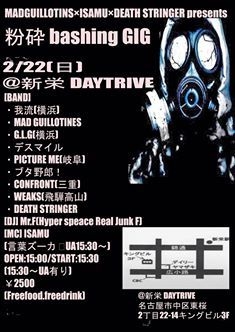 ´ÉÍý¿ÍÍÍ¡¢¹ðÃμºÎéÃפ·¤Þ¤¹¡£ ´ôÉ츩¤«¤é2BAND¤¬»²À魯¤ë̾¸Å²°»Ô¤ò»Ï¤á°¦ÃΡ¢´ôÉì¡¢»°½Å¡¢¿ÀÆàÀî(²£ÉÍ)¤«¤éÁ´9BAND½Ð±é¤ÎGIG¤ò³«ºÅ¡ª ¢£2015/2/22(Æü) ¡ÚTITLE¡Û "MAD GUILLOTINES¡ßISAMU¡ßDEATH STRINGEpresents"¡ØÊ´ºÕ bashing GIG¡Ù@¿·±É¡ÖDAYTRIVE¡×http://www.daytrive.com/ ¡ÚO/S¡Û 15:00/15:30 ¡ÚCHARGE¡Û \2,500(FreeDrink&FreeFood) ¡ÚBAND¡Û ¡¦²æÎ®(²£ÉÍ) ¡¦MAD GUILLOTINES ¡¦G.L.G(²£ÉÍ) ¡¦¥Ç¥¹¥Þ¥¤¥ë ¡¦PICTURE ME(´ôÉì) ¡¦¥Ö¥¿ÌîϺ¡ª ¡¦CONFRONT(»°½Å) ¡¦WEAKS(ÈôÂ͹⻳) ¡¦DEATH STRINGER ¡ÚDJ¡Û ¡¦Mr.F(Hy