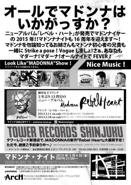 ¢¡ MADONNAnight ¡Ê¥³¥ß¥å´ÉÍý¿Í¤´Î»²ò¤Î¾å¡¢½ñ¤¹þ¤ó¤Ç¤¤¤Þ¤¹¡Ë Date : 3.6.fri 9PM- Place : ArcH ¢©160-0022 ¿·½É¶è¿·½É2-11-2 ¥«¡¼¥µ¥ô¥§¥ë¥Ç B1 Door : ¡ï3,000 / 1drink SNS or With flyer : ¡ï2,500 / 1drink Twitter : https://twitter.com/MDNA_NT ¥ª¡¼¥ë¤Ç¥Þ¥É¥ó¥Ê¤Ï¤¤¤«¤¬¤Ã¤¹¤«¡© MADONNA¡¢3ǯ¤Ö¤ê¤Î¥Ë¥å¡¼¥¢¥ë¥Ð¥à¡Ö¥ì¥Ù¥ë¡¦¥Ï¡¼¥È¡×¤ÎȯÇä¤òµÇ°¤·¤Æ¡¢3·î6Æü¡Ê¶â¡Ë¤Ë³«ºÅ¤¬·èÄꤷ¤¿¥Þ¥É¥ó¥Ê¥Ê¥¤¥È¡ª¤â¤Á¤í¤ó¶Ê¤Ï¥Þ¥É¥ó¥Ê¤Î¤ß¡ª¿·½É£²ÃúÌܤòÂåɽ¤¹¤ë¥Ñ¥Õ¥©¡¼¥Þ¡¼Ã£¤Ë¤è¤ë¥Þ¥À¡¼¥Ê¥·¥ç¡¼¤â¤ª³Ú¤·¤ß¤¤¤¿¤À¤±¤Þ¤¹¤è♡ ¤µ