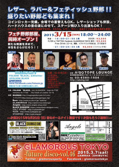皆さん、お待たせしました。 大好評でした昨年12月に引き続き、FOLSOM「BLACK」をAiSOTOPE LOUNGEのMain Floor にて開催いたします。 レザー、ラバー&フェティッシュ野郎!! 盛りたい野郎ども集まれ! コインロッカー完備、会場での着替えもOK、レザーショップも併設。 ハードハウスの音の波にのせて、ステージへの飛び入りもOK!! ジーンズ、Tシャツなどのラフな格好でもOK. もちろん、レザー、ラバー、全身タイツなど魅せる格好も歓迎! フェチ野郎部屋、同時オープン。 新たな刺激を求めて、本性をさらけだそう! 今後の開