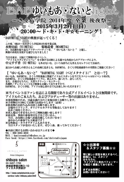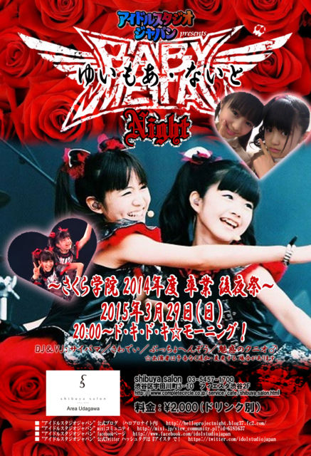 BABYMETAL NIGHTの興奮が返ってくる! この度、NHKホールのさくら学院2014年度卒業式後、 水野由結 (YUIMETAL) 菊地最愛 (MOAMETAL) の、全活動を振り返るアフターパーティーを、 “ ゆいもあ・ないと ” と題し、興奮の再現を実現する運びとなりました! 当日は東京、大阪にて開催のDJイベント、 “アイドルスタジオジャパン”を手掛けるDJ陣による、 様々な角度からのアプローチにより、 中元すず香 (SU-METAL) も外せないな、という気持ちにも答えるセレクトにてお届け。 遠方からお越しの皆さんもこの企画に是非とも