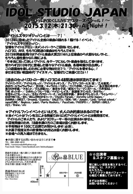 2010年代活躍中のアイドル楽曲をコンセプトに繰り広げるDJパーティー、 “アイドルスタジオジャパン” この度は、 アップアップガールズ(仮)/GEM/東京パフォーマンスドール/ Negicco/palet/まなみのりさ/ほか出演の、 “アイドルお宝くじLIVE” http://www.tv-asahi.co.jp/idol/event/ のアフターパーティーを実現致します! 場所は会場のEX THEATERから徒歩2分の、西麻布BAR BLUEです。 上記イベント出演アイドルの関連楽曲を中心とし、 平日の夜でも興奮続くオールナイトDJパーティーを開催を実現致します! 更に毎度好評のセ
