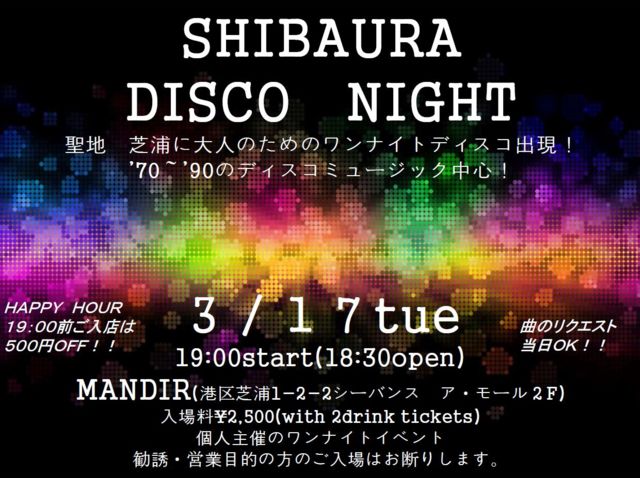 À»ÃÏ ¼Ç±º¤Ë¡¡Âç¿Í¤Î¤¿¤á¤Î¥ï¥ó¥Ê¥¤¥ÈDISCO½Ð¸½¡ù £³·î£±£·Æü ²ÐÍËÆü £±£¹»þ¡Á£²£³»þËø¡Ê³«¾ì£±£¸»þ£³£°Ê¬¡Ë ²ñ¾ì¡¡ÅìµþÅÔ¹Á¶è¼Ç±º1-2-2 ¥·¡¼¥Ð¥ó¥¹ ¥¢*¥â¡¼¥ë 2³¬ ¡¡¡¡¡¡¡¡¥Þ¥ó¥Ç¥£¡¼¥ë ¡¡¡¡¡¡¡¡¡¡ http://seavans-amall.jp/floorguide/mandir/ ¡¡¡¡¡¡¡¡¡¡https://ja-jp.facebook.com/Asian.Mandir ¡¡Æþ¾ìÎÁ 2,500±ß(with 2drink tickets) ¡¡¡¡HAPPY¡¡HOUR¡¡19:00Á°¤Ë¤´ÆþʤÏ500±ßoff¡ª '70 '80 '90ǯÂå¤Î¥Ç¥£¥¹¥³¥ß¥å¡¼¥¸¥Ã¥¯Ãæ¿´¤Î¥ï¥ó¥Ê¥¤¥È¥¤¥Ù¥ó¥È¡ù ¡Êͧ¿Í£Ä£Ê¤È¤Î¸Ä¿Í³«ºÅ¤Î¥¤¥Ù¥ó¥È¤Ç¤¹¡Ë ¶Ê¤Î¥ê¥¯¥¨¥¹¥ÈÅöÆü£Ï