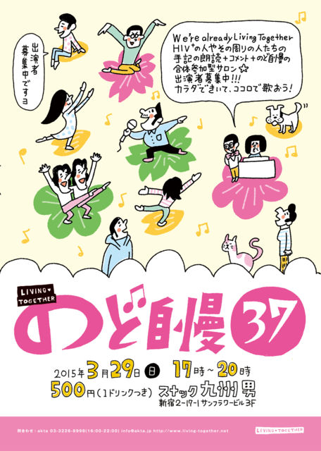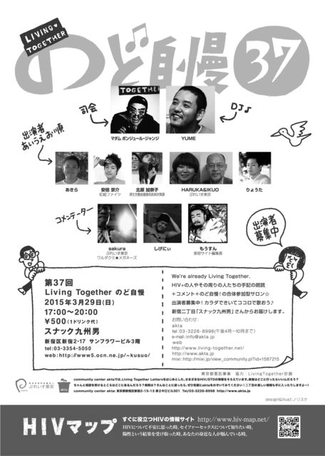 Âè37²ó¡¡Living Together ¤Î¤É¼«Ëý 2015ǯ3·î29Æü SUN. 17:00-20:00 Æþ¾ìÎÁ¡§500±ß¡¡(1¥É¥ê¥ó¥¯Âå) ¥¹¥Ê¥Ã¥¯¶å½£ÃË¡Êhttp://www5.ocn.jp/~kusuo¡Ë »Ê²ñ¡§¥Þ¥À¥à ¥Ü¥ó¥¸¥å¡¼¥ë•¥¸¥ã¥ó¥¸ DJ¡§YUME ¡Ú½Ð±é¼Ô¡Û ¡¦¤¢¤¤é ¡¦°ÂÇÜ µþ²ð¡ÊÆúÁÈ¥Õ¥¡¥¤¥Ä¡Ë ¡¦Ë̸¶ ²ÄÆà»Ò¡Ê¸üÀ¸Ï«Æ¯¾Ê·ò¹¯¶É¼ÀÉÂÂкö²Ý¡Ë ¡¦HARUKA&IKUO¡Ê¤×¤ì¤¤¤¹Åìµþ¡Ë ¡¦¤ê¤ç¤¦¤¿ ¡Ú¥³¥á¥ó¥Æ¡¼¥¿¡¼¡Û ¡¦sakura(¤×¤ì¤¤¤¹Åìµþ¡¢¥ï¥ë¥À¥¯¥ß¡ú¥á¥¬¥Í¡¼¥º) ¡¦¤·¤²¤Ë¤£ ¡¦¤â¤¦¤¹¤ó(ÈþÍÆ¥µ¥¤¥ÈÊÔ½¸Ä¹) We¡Çre already Living Together HIV+¤Î