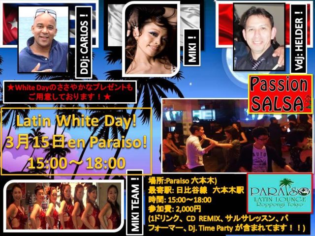Salsa Latin White Day! 3·î15Æüen Paraiso!Ï»ËÜÌÚ¡ªMiki lesson! Dj. Carlos &Vdj. Helder! ¡ú¡ù¡ú¡ù¨¬¨¬¨¬¨¬¨¬¨¬¨¬¨¬¨¬¨¬¨¬¨¬¨¬¨¬¨¬¡ú¡ù¡ú¡ù Passion SALSA Latin White Day at Paraiso Ï»ËÜÌÚ Afternoon Party¡ª¢ö¢ö Æü»þ¡§3·î15Æü(Æü) 15:00¡Á18:00 ¾ì½ê¡§Paraiso Latin Bar ÅìµþÅÔ¹Á¶èÏ»ËÜÌÚ7-10-3 ¾®ÎÓ¥Ó¥ë£Â1 ºÇ´ó±Ø¡§ÆüÈæÃ«Àþ¡¡Ï»ËÜÌÚ±Ø ¥¢¥¯¥»¥¹:http://www.paraiso-bar.com/jp/access.html »²²ÃÈñ¡§2000±ß¡¡ (1¥É¥ê¥ó¥¯ÉÕ¤¡ª CD REMIX¡¦¥µ¥ë¥µ¥ì¥Ã¥¹¥ó¡¦¥Ñ¥Õ¥©¡¼¥Þ¥ó¥¹¡¢ ¡õDj. Time ¤¬´Þ¤Þ¤ì¤Æ¤Þ¤¹¡ª) ¡ö¤½¤ì°Ê¹ß