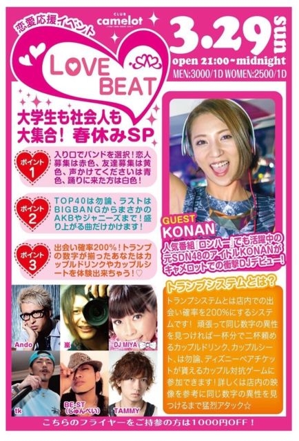 º£Ì롪¡ª¡ª 3/29(Æü¡Ë¤ÏĶÏÃÂê¤Î¥¤¥Ù¥ó¥ÈLOVE BEAT¡ù¥é¥Ö¥Ó¡¼¥È¤¬¡ª¡ª¡ª¡ª ½Â륥ã¥á¥í¥Ã¥È¤Ë¤Æ³«ºÅ¡ª Ëè²ó»²²Ã¼Ô1000¿Íµ¬ÌÏ¡ª¡ª ¹ë²Ú¥²¥¹¥È¤ä¥µ¥×¥é¥¤¥º¤â¤¢¤ê¤ªÁû¤¬¤»¤Ê¤³¤Î¥¤¥Ù¥ó¥È ¡ª º£²ó¤Ï¿Íµ¤ÈÖÁÈ¥í¥ó¥Ï¡¼¤Ç¤â³èÌöÃæ¤Î¸µSDN48¤Î¥¢¥¤¥É¥ëKONAN¤¬¥¥ã¥á¥í¥Ã¥È¤Ç¤Î¾×·âDJ¥Ç¥Ó¥å¡¼¡ª ¤¼¤ÒÍè¤Æ¤¯¤À¤µ¤£¡ù ¤³¤ì¤ò¸«¤¿Êý¤À¤±¤ÎÆÃŵ¤Ë¤Ê¤ê¤Þ¤¹!!!!!!!! ¤Ê¤ó¤ÈÅöÆü¤Ï!½Â륥ã¥á¥í¥Ã¥È¤ÎÆþ¤ê¸ý¤Ç¡ÖDJ MIYA¤Î¥²¥¹¥È¤Ç¥é¥ÖÃíÆþ!¡×¤È¸À¤Ã¤Æ¤¤¤¿¤À¤±¤ë¤À¤±¤Ç ¡ÚÆÃÊ̥ǥ£¥¹¥«¥¦¥ó¥È ²Á³Ê¡ÛÃËÀ2000/1D¡¢½÷À1500/1