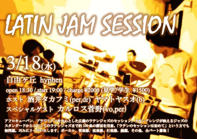 »²²Ã·¿¥é¥Æ¥ó¥¸¥ã¥à¥»¥Ã¥·¥ç¥ó¤Î¤´°ÆÆâ¤Ç¤¹!! º£·î3/18(¿å)LJ¥»¥Ã¥·¥ç¥ó¤Ï¤ª¤«¤²¤µ¤Þ¤Ç20²óÌܤò·Þ¤¨¤Þ¤¹¡£ º£²ó¤Ï¥¹¥Ú¥·¥ã¥ë¥²¥¹¥È¤È¤·¤Æ¤Ê¤ó¤ÈÇ®ÂÓJAZZ³ÚÃĤΥ«¥ë¥í¥¹¿ûÌ¤ó¤¬»²²Ã¤·¤Æ²¼¤µ¤ë»ö¤Ë¤Ê¤ê¤Þ¤·¤¿¡ª µÇ°¤¹¤Ù¤20²óÌÜ¡¢³§¤ÇÆø¤ä¤«¤Ë³Ú¤·¤ß¤¿¤¤¤Î¤Ç¥×¥í¥¢¥ÞÌä¤ï¤º¤¼¤Ò¤´»²²Ã²¼¤µ¤¤¡£¤ªÂÔ¤Á¤·¤Æ¤ª¤ê¤Þ¤¹¡ª 3·î18Æü(¿å) LATIN JAM SESSION vol.20 at ¼«Í³¥öµÖ¥Ï¥¤¥Õ¥ó open 18:30 / start 19:00 / ¡ï2000(¸«³Ø/³ØÀ¸¡ï1500) ¡¡ ¥Û¥¹¥È ¼ò°æ¥¿¥«¥Õ¥ß(per,dr)¥ä¥Þ¥È¥ä¥¹¥ª(b) ¥¹¥Ú¥·¥ã¥ë¥²¥¹¥È ¥«¥ë¥í¥¹¿ûÌî(vo,per) ¥¢¥Õ¥í