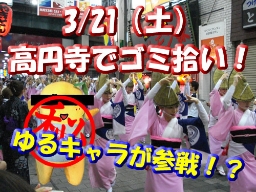 高円寺でゴミ拾いしまーす 今回は「ちょうせい豆乳くん」と「トマト人間」が参加します ちょうせい豆乳くん http://matome.naver.jp/odai/2135884640587133901 トマト人間 https://twitter.com/ricopin4649 終わった後はみんなでランチしまーす ゴミ拾いのみの参加もオッケーです お店を予約しますので、ランチ希望の方は申し込み時にお知らせください。 ゆるキャラ企画 ゴミ拾い活動を応援してください! ゆるキャラと写真を撮ってSNSに投稿して頂いた方にはチロルチョコを5個プレゼント