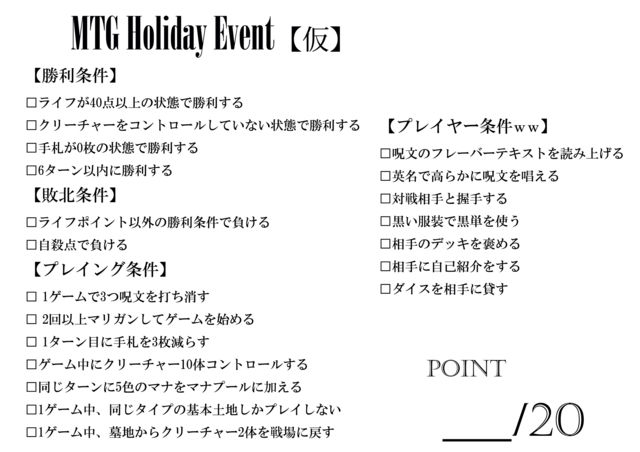 管理人様貴重なスペース拝借します。 『ミッション型デュエル大会』 カードゲーム『マジック・ザ・ギャザリング』のオフ会です。 ちょっと変わったマジックのイベントができたらなぁっと思って企画しました。 内容はマジック・ザ・ギャザリング公式プレリリース大会でブロック毎に封入されているデュエルのプレイングへの条件が記入された手紙をもとに! 普通の勝利を求めないパーティー感覚なデュエルができるオリジナルなプレイ条件シートで遊ぼうという企画です。 仮で作ったプレイ条件シートの画像を貼りました。 シー