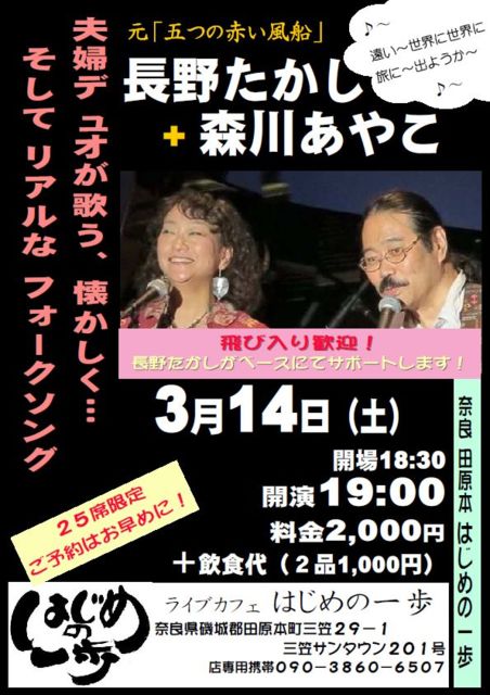 長野たかし+森川あやこ ◎夫婦デュオが歌う、懐かしく… そして リアルな フォークソング ◆時間:開場18時30分 開演19時 ◆場所:奈良・田原本 ライブカフェ「はじめの一歩」 ・奈良県磯城郡田原本町三笠29−1 三笠サンタウン201号 ・店専用携帯090−3860−6507 ・近鉄田原本・西田原本駅より南へ約300メートル。徒歩約5分 http://hajime-no-ippo.com/ ◆出演:長野たかし(元「五つの赤い風船」) 森