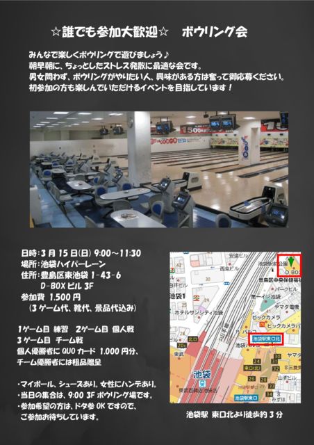 ¤ß¤ó¤Ê¤Ç³Ú¤·¤¯¥Ü¥¦¥ê¥ó¥°¤ÇÍ·¤Ó¤Þ¤·¤ç¤¦ (^O^)¡¿ Ä«¡¢ÁáÄ«¤Ë¤Á¤ç¤Ã¤È¤·¤¿¥¹¥È¥ì¥¹È¯»¶¤ËºÇŬ¤Ê²ñ¤Ç¤¹¡£ Ã˽÷Ìä¤ï¤º¡¢¥Ü¥¦¥ê¥ó¥°¤¬¤ä¤ê¤¿¤¤¿Í¡¢¶½Ì£¤¬¤¢¤ëÊý¤Ïʳ¤Ã¤Æ¸æ±þÊ礯¤À¤µ¤¤¡£ ½é»²²Ã¤ÎÊý¤â³Ú¤·¤ó¤Ç¤¤¤¿¤À¤±¤ë¥¤¥Ù¥ó¥È¤òÌܻؤ·¤Æ¤¤¤Þ¤¹¡£¢ö Æü»þ 3·î15Æü(Æü) 9:00¡Á11:30 ¾ì½ê ¥Ï¥¤¥Ñ¡¼¥ì¡¼¥ó ½»½ê ËÅç¶èÅìÃÓÂÞ1-43-6 D-BOX¥Ó¥ë3F ½¸¹ç 9:00 ¸½Ãϥܥ¦¥ê¥ó¥°¾ì 3F¼õÉÕ ¥¢¥¯¥»¥¹ ÃÓÂÞ±Ø ÅìË̸ý¤«¤éÅÌÊâ3ʬ Ê罸´ü¸Â ÅöÆü¥É¥¿»²OK¡ÊÅöÆü8:00¤Þ¤Ç¼õÉÕ¡Ë »²²ÃÈñ 1,500±ß (3¥²¡¼¥àÂå¡¢·¤Âå¡¢·ÊÉÊÂå¹þ¤ß) £±¥²¡¼¥àÌÜ Îý½¬ £²¥²