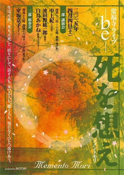 http://bigtory.jp/event2015/20150404.html 日時:2015年4月4日18:30 出演:室坂京子 (ピアノ) 料金:3,000円 (予約制) 終了後のお弁当をご希望の方はなるべくご予約時にお申し込みください(1000円)。 会場:臨済宗常福寺 相模原市南区新戸2516 http://www.jofukuji.or.jp/ 予約:臨済宗常福寺 TEL:046-251-5530 FAX;046-255-3372 info@jofukuji.or.jp 予約問合せ:BIGTORY TEL:03-3419-6261 bigtory@mba.ocn.ne.jp http://bigtory.jp/ 昼間の講演会(無料)と合わせてご参加いただけます。 第1部 講演「Memento mor