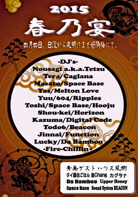 春乃宴2015 -ハルノウタゲ- Open Air Free Party in 好隣梅(こうりんばい) Organized By 青島ゲストハウス風樹 4/4(Sat) Start 18:00 _ Finish 08:00 -DJ's- 17:00-18:00_Nousagi a.k.a.Tetsu 18:00-19:00_Tera/Caglana 19:00-20:00_Masato/Space Base 20:00-21:30_Yas/Function 21:30-23:00_Yuu/604/Ripples 23:00-24:30_Toshi/Space Base/Hooju 24:30-02:00_Shou-kei/Horizon 02:00-03:30_Kazuma/Digital Code 03:30-05:00_Todo6/Beacon 05:00-06:30_Jinnai/Function 06:30-08:00_Lucky/Da Bamboo -Fire- Chillin+ -D