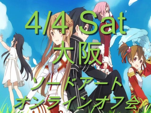 管理人様、スペースをお貸し頂きありがとうございます。 〔4/4(土)大阪ソードアートオンラインオフ会✩」〕 20代・30代中心のイベントです♪ 人数に合わせて最適な会場をご用意します。 堅苦しい雰囲気はありませんのでお一人様でも気軽にご参加下さい ★とにかく「ソードアートオンライン」好きが集まるオフ会イベント! 「SAO