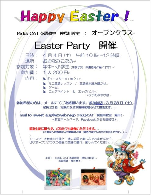 Äê°÷¤Þ¤Ç¼ã´³Í¾Íµ¡Ê3Ì¾ÄøÅ١ˤ¬¤¢¤ê¤Þ¤¹¤Î¤Ç¡¢Ê罸´ü¸Â±äŤ·¤Þ¤·¤¿¡£ ¤ß¤ó¤Ê¤Ç½Õ¤ò³Ú¤·¤ß¤Þ¤·¤ç¤¦ °ìÈÌ»²²Ã¼Ô¤òÊ罸¤·¤Æ¤Î¡Ö¥¤¡¼¥¹¥¿¡¼¥Ñ¡¼¥Æ¥£¡¼¡×³«ºÅ¤·¤Þ¤¹¡£ ¤´ÅÔ¹ç¤Î¤Ä¤¯Êý¤Ï¡¢¤¼¤Ò»²²Ã¤·¤Æ¤¯¤À¤µ¤¤¡£ ºÇ´ó¤ê±Ø¤Ï¡¢µþÀ®¸¡¸«Àî±Ø¤Ë¤Ê¤ê¤Þ¤¹¡£ ±Ø¤è¤êÅÌÊâ10ʬ¤Î¾ì½ê¤Ë¤Ê¤ê¤Þ¤¹¡£ ¾ì½ê¡§¤ª¤ä¤³¥«¥Õ¥§¸¡¸«Àîin¤ª¤ª¤Ê¤ß¤³¤Ê¤ß ¥×¥Á±Ñ¸ì¥ì¥Ã¥¹¥ó/±Ñ¸ì³¨Ëܯɤßʹ¤«¤» ¥²¡¼¥à ¥¨¥Ã¥°¥Ú¥¤¥ó¥È+¥¨¥Ã¥°¥Ï¥ó¥È¡Ê¥×¥Á¤ª¤ß¤ä¤²ÉÕ¡Ë »²²ÃÂоݡ§Ç¯Ãæ¡Á¾®