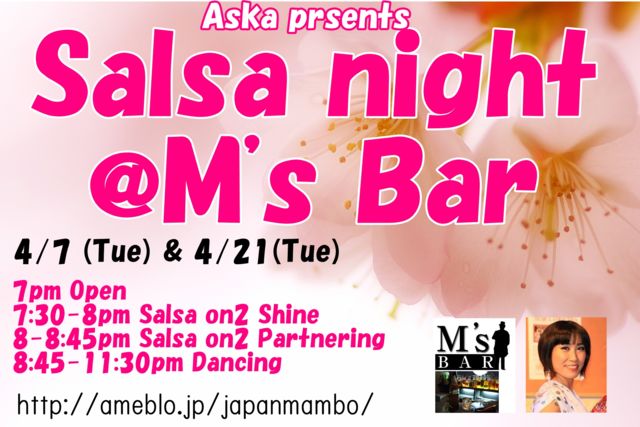 Salsa Night¡÷ÆîÇðM's Bar Âè1¡¢Âè3²ÐÍËÆü³«ºÅ¡ùÆîÇð¤Î¥¢¥Ã¥È¥Û¡¼¥à¤Ê¥Ð¡¼¤Ç°û¤ó¤ÇÍ٤äƾФäƸì¤Ã¤Æ¡¢³Ú¤·¤¤Ìë¤ò²á¤´¤·¤Þ¤·¤ç¤¦¡ùÁª¶Ê¤Ï¥µ¥ë¥µ¡¢¥Þ¥ó¥Ü¡¢¥Ð¥Á¥ã¡¼¥¿¡¢¥á¥ì¥ó¥²¡¢¥Á¥ã¥Á¥ã¡ª½é¿´¼Ô¤µ¤ó¤â°Â¿´¤Î¥ì¥Ã¥¹¥óÉÕ¤¢ö ¡ÚÆüÄø¡Û¡¡4/7¡Ê²Ð¡Ë ¡Ú»þ´Ö¡Û 19:00¡¡¥ª¡¼¥×¥ó 19¡§30-20¡§00¡¡½éµé¥µ¥ë¥µ¡¡NYon2¡¡¥·¥ã¥¤¥ó 20¡§00-20¡§45¡¡½éµé¥µ¥ë¥µNY on2¡¡¥Ú¥¢ 20:45¡Á23:30¡¡¥Õ¥ê¡¼¥¿¥¤¥à¡¡ ¡ù19¡§15¤Þ¤Ç¤Ë¤ª±Û¤·Äº¤¤¤¿Êý¤Ë¡¢¥¦¥§¥ë¥«¥à¥É¥ê¥ó¥¯¥µ¡¼¥Ó¥¹¤¢¤ê¡ª ¡Ê¥³¡¼¥Ò¡¼¹ÈÃã¡¢¥¦¡¼¥í¥óÃ㤫¤é¤ª¤Ò¤È¤Ä¤ªÁª¤Ó²¼¤µ¤¤¡Ë ¡ÚÈñÍÑ