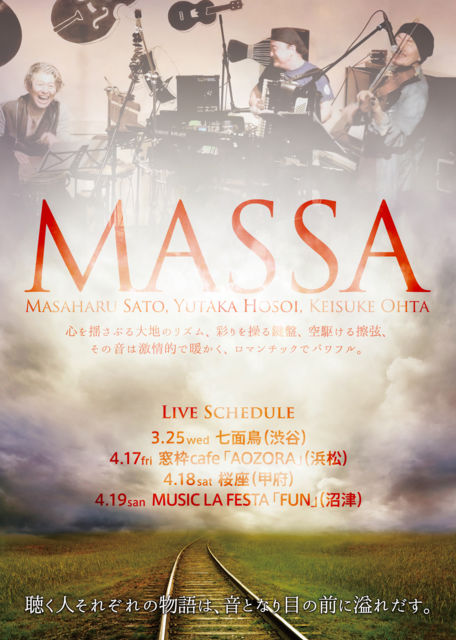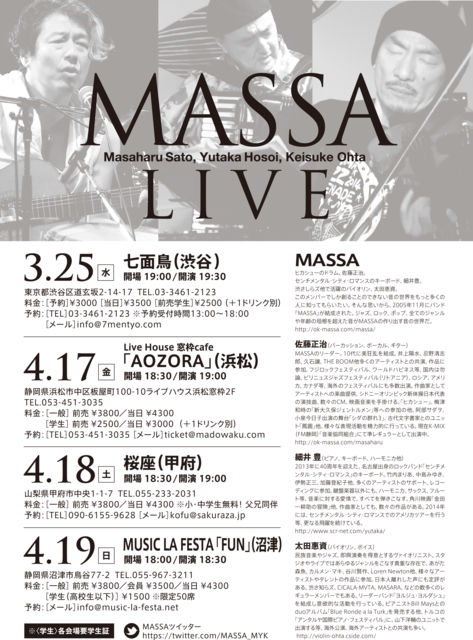 ヒカシューのドラム、佐藤正治 センチメンタル・シティ・ロマンスのキーボード、細井豊 渋さ知らズ、CICALA-MVTA他で活躍、太田恵資 このメンバーでしか創ることの出来ない音の世界をっもっと多くの人に知って貰いたい。 そんな思いから結成された「MASSA」 ジャズ、ロック、ポップ、全てのジャンルや年齢の垣根を超えたMASSAの世界… 桜座で、一期一会の時をお過ごしませんか。 ーーーーーーーーーーーーーー 日程:4月18日(土) 会場:甲府 桜座 住所:山梨県甲府市中央1-1-7 TEL:055-233-2031 料金:一般前売¥3800 当日