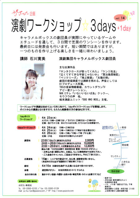 ¥¥ã¥é¥á¥ë¤Î·àÃİ÷¤¬¼ÂºÝ¤Ë¤ä¤Ã¤Æ¤¤¤ë¥²¡¼¥à¤ä ¥¨¥Á¥å¡¼¥É¤òÄ̤·¤Æ¡¢3Æü´Ö¤Ç¼Çµï¤Î¥ï¥ó¥·¡¼¥ó¤òºî¤ê¤Þ¤¹¡£ ºÇ½ªÆü¤Ë¤Ï¥×¥Á¸ø±é¤â¹Ô¤¤¤Þ¤¹¡£Ã»¤¤´ü´Ö¤Ç¤Ï¤¢¤ê¤Þ¤¹¤¬¡¢ °ì¤Ä¤Î¤â¤Î¤òºî¤ê¾å¤²¤ë³Ú¤·¤µ¤ò°ì½ï¤ËÌ£¤ï¤¤¤Þ¤·¤ç¤¦¡£ ¡ù¥ï¡¼¥¯¥·¥ç¥Ã¥×¤ä±é·à¤Ï½é¤á¤Æ¤È¤¤¤¦Êý¤Ë¸þ¤±¤Æ¡¢ 1day¥Ü¥¤¥¹¥ï¡¼¥¯¥·¥ç¥Ã¥×¤ò³«ºÅ¤·¤Þ¤¹¡£ ¥Ü¥¤¥¹Ãæ¿´¤Î¹ÖºÂ¤È¤Ê¤ê¤Þ¤¹¤Î¤Ç¡¢¤â¤Á¤í¤ó·Ð¸³¼Ô¤ÎÊý¤Î »²²Ã¤âOK¤Ç¤¹¡£ ¹Ö»Õ¡§ÀÐÀî´²Èþ¡¡¥×¥í¥Õ¥£¡¼¥ë ±é·à½¸ÃÄ¥¥ã¥é¥á¥ë¥Ü¥Ã¥¯¥¹·àÃİ÷¡£ ¼ç¤Ê½Ð±éºîÉÊ ¡Ö¥µ¥ó¥¿¥¯¥í¡¼¥¹¤¬²Î¤Ã¤Æ¤¯¤ì¤¿¡×¡Ö¥±¥ó¥¸ÀèÀ¸¡× ¡Ö¥«¥ì¥Ã