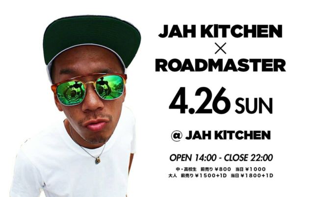 【EVENT INFO】 Jah Kitchen×RoadMaster Presents 日本テレビ [月曜から夜ふかし]でもはやキラーコンテンツになり世間のお茶の間を騒がせたパーリーピーポーHIPHOP集団の “イルマニア”から MCとして10年のキャリアをもつ “MCMA” を迎えて 中・高校生から主婦まで盛り上れるDAY EVENT開催!! 2015.04.26(SUN) @JAH KITCHEN OPEN 14:00 CLOSE 22:00 中・高校生 前売¥800 当日¥1000 大人 前売¥1500+1D 当日¥1800+1D ※前売りは100枚限定です。 GUEST LIVE MCMA (イルマニア) LIVE STOCK (Zion Sold