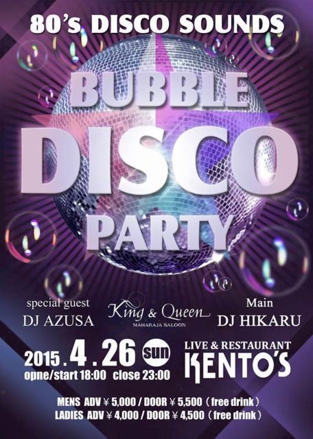 ■■■DJ AZUSA:出演イベント■■■ 2015.4.26(Sun) -80's DISCO SOUNDS- 『バブル DISCO PARTY パート2』 @ライブハウスKENTOS静岡 OPEN 18:00 CLOSE 23:00 男性 5000円 飲み放題! (当日5500円) 女性 4000円 飲み放題!(当日4500円) MAHARAJA SAROON "King & Qeen" DJs [Special Gust DJ] DJ AZUSA [Main DJ] DJ HIKARU @ライブハウスKENTOS静岡 静岡市葵区両替町2丁目7−10両替町ビル5F 054-251-8585 http://sz-kentos.jp