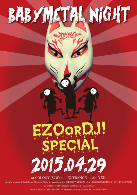 なかなか札幌では見ることの出来ないBABYMETAL。 だけど札幌でも大音量でBABYMETALをライブのごとく楽しみたい! そんな思いが遂に叶いました!! 札幌でロックDJイベントを開催しているEZOorDJ!が今回、特集に選んだのは BABYMETAL!!!! しかもただ単にDJをするわけではありません。 ゆいもあに少しの年齢というスパイスをふりかけた振りコピユニットが全曲踊ります。 会場はライブハウス!まさにライブのように盛り上がれる1時間弱。 皆でW.O.Dしませんか? 『EZOorDJ! SPECIAL 〜BABYMETAL NIGHT〜』 2015年4月29日(水祝)