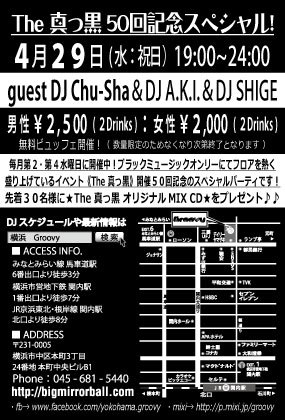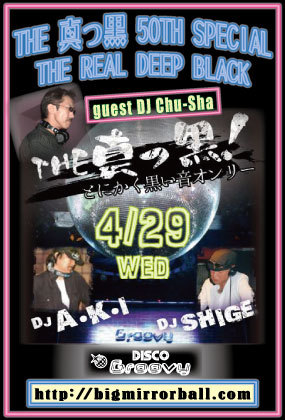 第2・第4水曜日に開催中のイベント【THE 真っ黒】今回は第50回開催記念のパーティです♪ スペシャルゲストとして DJ Chu-Sha も参加し、ますます真っ黒な一夜を皆様へお届けします!いつものDISCO Groovyではなかなか聴くことのできないレアなFUNK&SOUL MUSICを是非ご堪能ください♪ 【先着30名様に★THE 真っ黒 オリジナルMIX CD★プレゼント!】 【DJ's】 A.K.I. / SHIGE/ guest Chu-Sha 【音楽】 BLACK ALL MIX 【開催時間】 19:00〜24:00 【料金】 男性:¥2,500/2D+ビュッフェ 女性:¥2,000/2D+ビュッフェ (ビュ