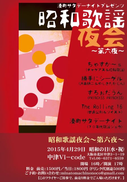 管理人様いつもお世話になっております。 この度、CHAGE&ASKAカバーバンドの(ちゃすか〜s)がLIVE出演が決まりましたので 告知させて頂きます。 よろしくお願いします。 簡単にLIVE内容を記載しておきます 昭和歌謡夜会 第六夜 日時 2015年4月29日(水・祝) 場所 Vi-code 〒531-0071 大阪市北区中津3-1-19 Tel.06-6371-6559 Fax.06-6371-6549 http://www.vi-code.com/ チケット 前売1500円 当日1800円 です。 演奏出