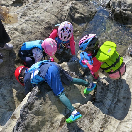 【ライフジャケット普及活動】 三浦半島最南の海岸線は…春の海をたっぷり楽しめます。 この日の干潮08:35 0.7m/満潮14:35 1.1m コースの大半は広い岩礁。 小さなお子さんも安心して楽しめる磯遊びコース。 磯を好む海の生き物たちにたくさん出会えます♪ ライフジャケットを着用して遊ぶことの窮屈さではなく、 ライフジャケットを着用して遊ぶことの自由さや楽しさを体験してくださいね。