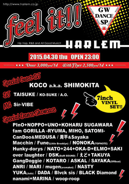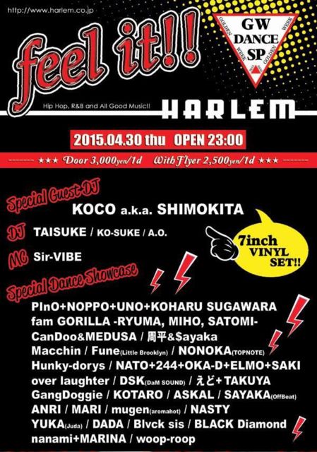 2015/04/30(thu) feel it!! -GW Dance Special- at 渋谷 HARLEM ★★★ GOOD MUSIC & SPECIAL SHOW ★★★ 音を感じあいませんか♪ SPECIAL GUEST DJには 1月のfeel it!!でのプレイも記憶に新しい 最高のプレイとパフォーマンスでオーディエンスをロックするDJ!! "KOCO a.k.a. SHIMOKITA" が再びHARLEMに登場!!! 世界のDJ達を唸らせる最上級のプレイがまた待っています! もちろん7inch VINYL ONLYでのプレイ!! 見逃し、聴き逃し厳禁です! まさに "feel it!!" な夜になるでしょう!! 世界のVINYL DIGGERをも