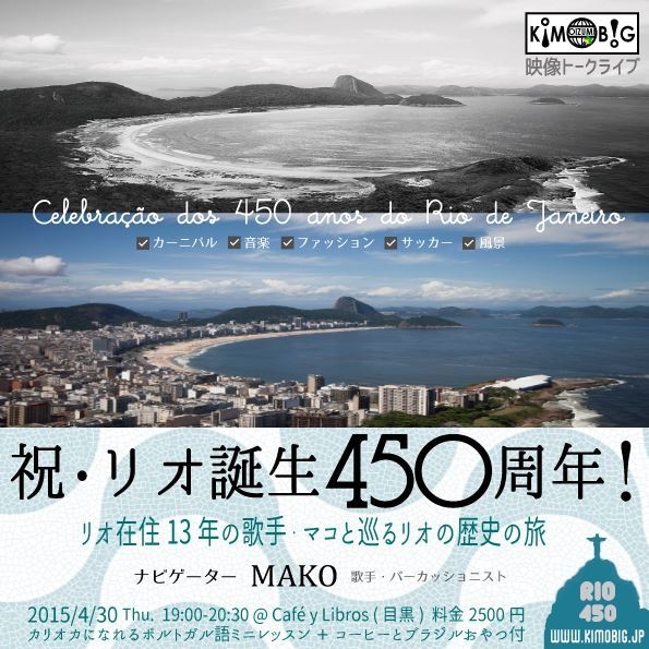 祝・リオ誕生450周年記念イベント!映像トークライブ 「リオ在住13年の歌手・マコと巡るリオの歴史の旅」4/30(木)開催 「Cidade Maravilhosa (シダーヂ マラヴィリョーザ)=美しい街」としてブラジル国民も憧れるリオ・デ・ジャネイロ市は今年、誕生450周年を迎えます。現代に至るまで、海と山の絶妙なバランスが魅力の美しい景色はそのままに、街並みや音楽、ファッション、カーニバル、サッカーはダイナミックに変化を重ねてきました。 リオ在住13年の歌手、マコさんの軽快な映像トークライブで、昔のリオに「タイムスリップ」して、彼の地に思