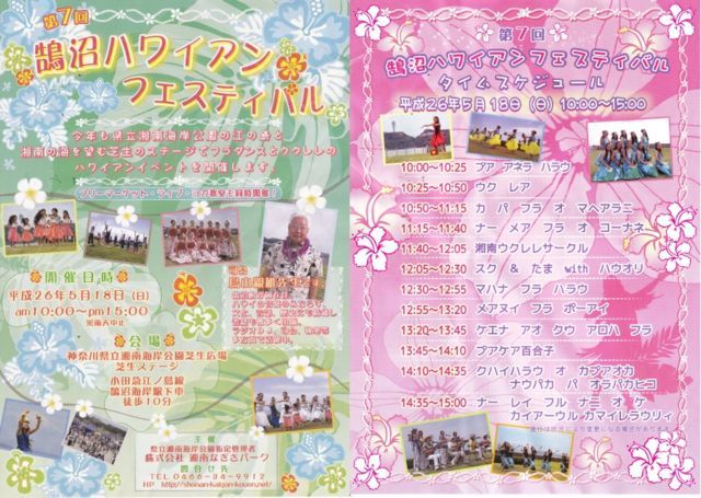 皆さん、 今年も鵠沼ハワイアンフェスへの参加依頼が来ました。 今年は2日間の開催で、5月16日が(土)がケイキ部門、5月17日(日)がワヒネ他部門となっており、湘南ウクレレサークル(SUC)は17日(日)の出演を申請したいと思っています。 SUCは第1回から出演しており、大切なイベントだと思いますし、何より場所が最高!!また今年も皆で楽しみましょう!!! とりあえず、参加人数と練習スケジュール調整を行いたいので、参加希望の方は意思表示をお願いします。初心者も、初参加も大歓迎です!!ただし、当日までに何回か練習会に参加で